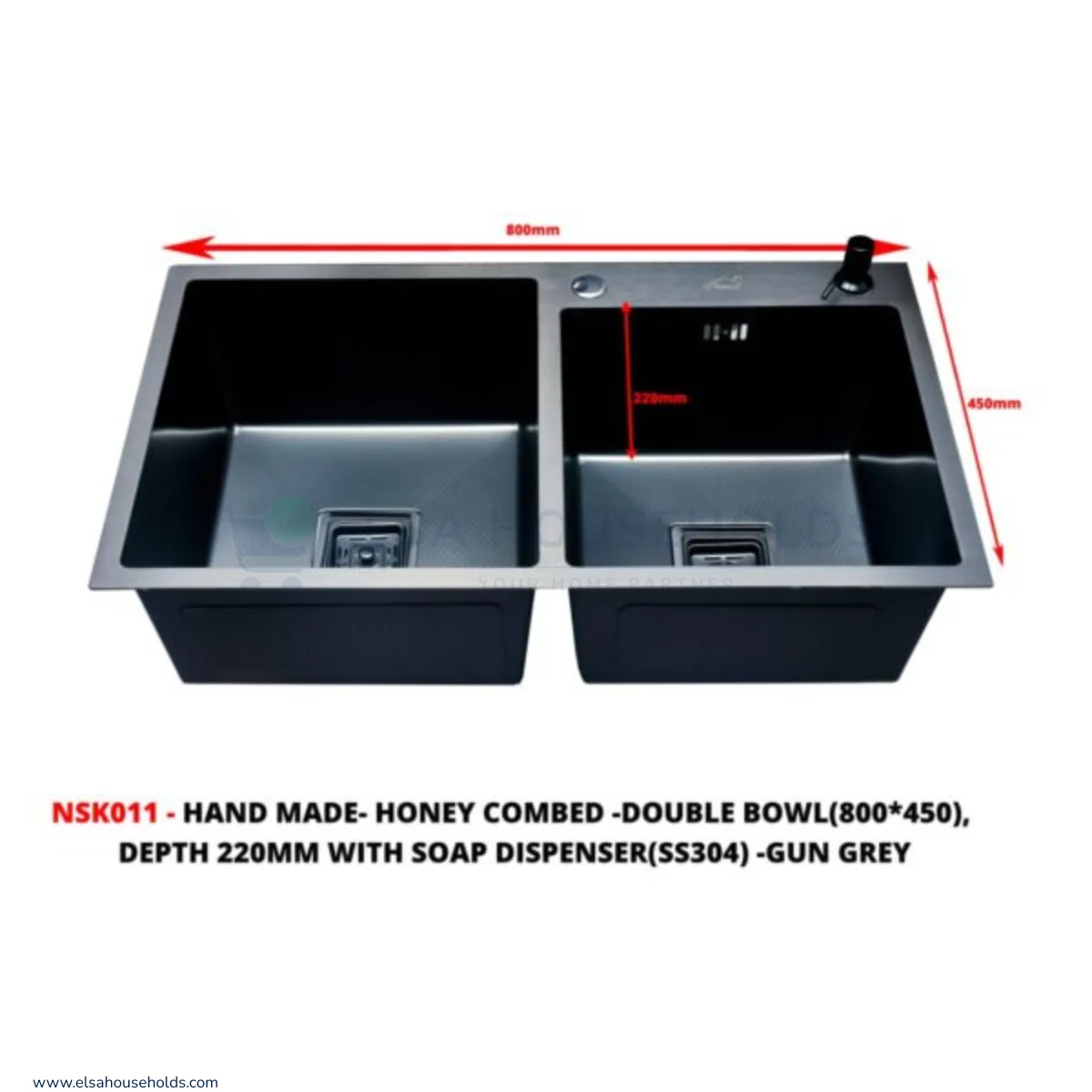 The Handmade Double Bowl Kitchen Sink (800×450) – Gun Grey is crafted with precision to meet the needs of modern homes and commercial kitchens. Built from high-quality stainless steel, this sink is engineered for strength, durability, and resistance against scratches, rust, and stains, ensuring long-lasting performance.